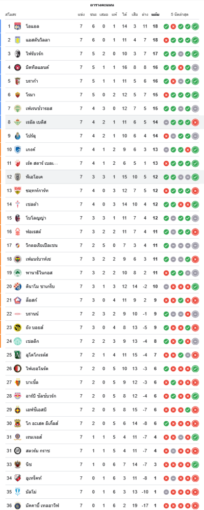 ด้านเรอัล เบติสยังมี 14 แต้มจาก 7 นัด สถิติชนะ 4 เสมอ 2 แพ้ 1 ประตูได้เสีย +5 ยังคงอยู่ในโซนบนของตาราง แต่การแพ้แบบหมดรูปให้พีเอโอเคทำให้โอกาสติดกลุ่มท็อป 8 ยังไม่การันตี ต้องไปลุ้นในนัดสุดท้ายว่าจะรักษาพื้นที่หัวตารางไว้ได้หรือไม่