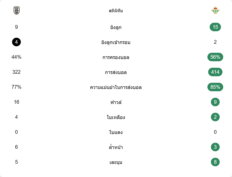 ตัวเลขหลังเกมบอกชัดว่าเกมนี้ไม่ได้เป็นการบังเอิญ พีเอโอเคยิงรวม 9 ครั้ง เข้ากรอบ 4 ส่วนเรอัล เบติสได้ลุ้นถึง 15 ครั้ง แต่ตรงกรอบแค่ 2 แสดงให้เห็นว่าจังหวะจบสกอร์ไม่คม ทั้งที่ทีมเยือนครองบอลมากกว่าที่ 56% ต่อ 44%