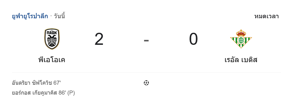 ช่วงทดเวลาบาดเจ็บ 5 นาที เบติสพยายามยิงไกลลุ้นตีไข่แตก แต่หลุดกรอบไปเอง หมดเวลา พีเอโอเคอัดทีมดังจากลาลีกา 2-0 เก็บชัยสุดโหดต่อหน้าแฟนบอลตัวเอง