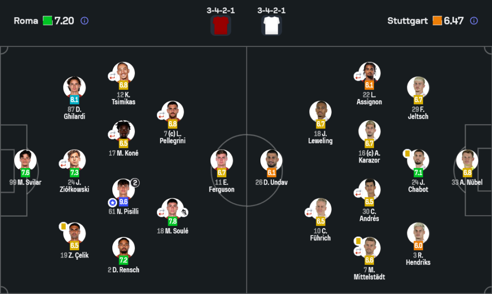 เด็กหนุ่มวัยหวดของหมาป่ากรุงโรมแสดงให้เห็นว่าไม่ต้องดังระดับโลกก็แบกทีมได้ ถ้ามีทั้งหัวใจและคุณภาพ ปิซิลลีฉีกแนวรับสตุ๊ตการ์ทตลอดทั้งเกม การเคลื่อนที่หาช่องคือจุดเด่น เขายืนระหว่างเซ็นเตอร์แบ็กและวิงแบ็กของคู่แข่งได้อย่างชาญฉลาด ประตูแรกมาเพราะการสอดจังหวะเดียวกับบอลทะลุช่องของโซอูเล ส่วนประตูที่สองคือความเยือกเย็นในช่วงทดเวลาเจ็บ รับบอลจากดิบาลาแล้วจบสกอร์แบบไม่ลังเล
