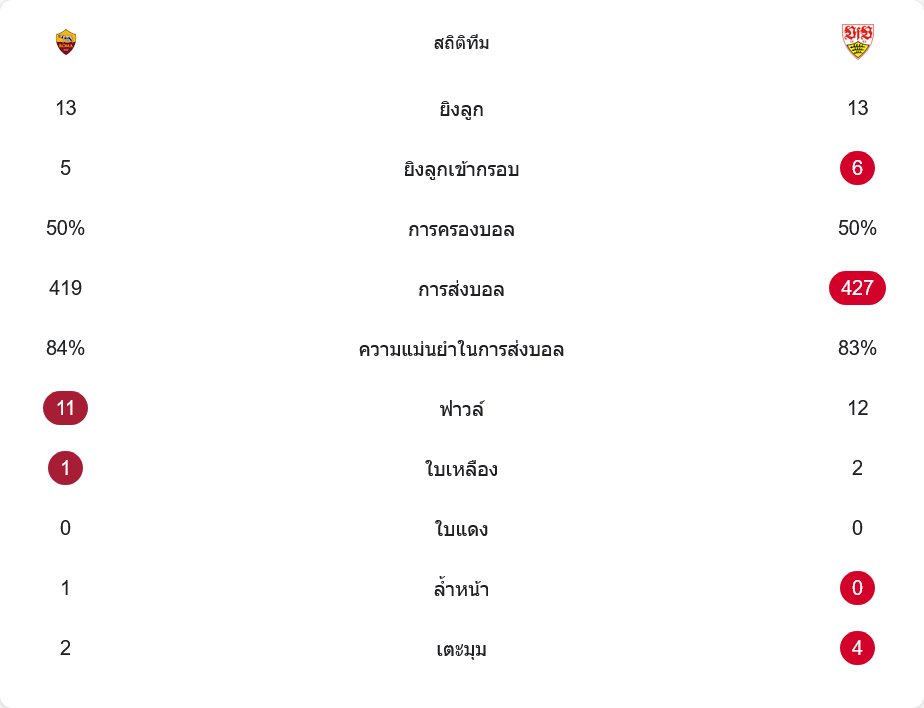 ตัวเลขหลังเกมบอกชัดว่านี่คือเกมที่สูสีแบบไม่มีใครยอมใคร ทั้งโรม่าและสตุ๊ตการ์ทยิงรวมฝั่งละ 13 ครั้ง เจ้าถิ่นยิงเข้ากรอบ 5 ครั้ง ส่วนทีมเยือนกดได้ถึง 6 ครั้ง แสดงให้เห็นว่าทีมเยือนมีโอกาสลุ้นประตูพอๆ กัน การครองบอลแบ่งกันทีมละ 50% การส่งบอลก็แทบไม่ต่างกัน โรม่าออกบอล 419 ครั้ง ขณะที่สตุ๊ตการ์ท 427 ครั้ง และความแม่นยำอยู่ที่ 84% ต่อ 83% ตามลำดับ