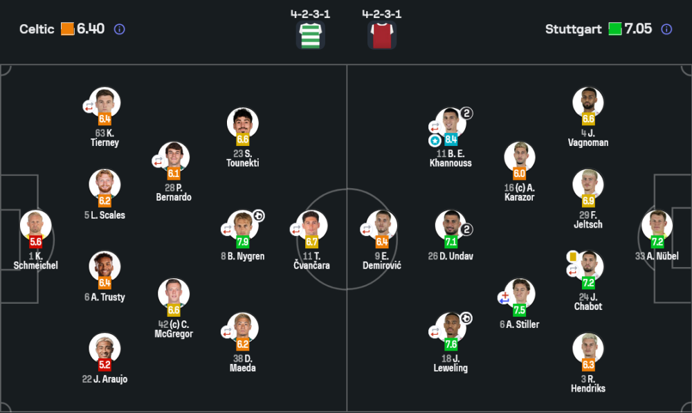 ขณะที่เกมรับของสตุ๊ตการ์ทจัดโซนได้แน่น พอเสียบอลจะถอยคุมพื้นที่หน้าเขตโทษ ไม่ไล่หลุดตำแหน่งง่าย ๆ ทำให้เซลติกต้องยิงติดบล็อกหลายครั้ง หรือจบแบบไม่มีคุณภาพ ต่อให้มีช่วงที่เจ้าถิ่นครองบอลมากกว่าเล็กน้อย แต่การขึ้นเกมของสตุ๊ตการ์ทชัดเจนกว่า โดยเฉพาะการเปลี่ยนจากรับเป็นรุกผ่านอุนดาฟที่เชื่อมเกมได้เนียน ส่งให้เอล คานนูสส์และเลเวลิงมีพื้นที่เล่น จุดตัดสินเกมคือความคมในพื้นที่สุดท้าย สตุ๊ตการ์ทยิงเข้ากรอบมากกว่าและเปลี่ยนโอกาสเป็นประตูได้จริง ส่วนเซลติกมีโอกาสแต่จบไม่ลง แถมโดนหมัดสวนซ้ำจนเกมหลุดมือ