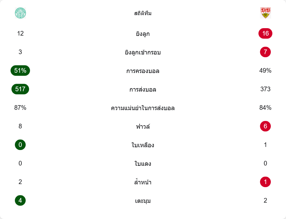 เกมนี้ตัวเลขบอกทุกอย่าง เซลติกยิงทั้งหมด 12 ครั้ง เข้ากรอบแค่ 3 ขณะที่สตุ๊ตการ์ทยิง 16 ครั้ง เข้ากรอบ 7 และนั่นคือความต่างของทีมที่ “สร้างโอกาสแล้วปิดบัญชี” กับทีมที่ “มีจังหวะแต่ปล่อยหลุดมือ” การครองบอลเจ้าถิ่นเหนือกว่านิด ๆ 51 ต่อ 49 พร้อมจำนวนการจ่ายบอล 517 ต่อ 373 และความแม่นยำการจ่าย 87 เปอร์เซ็นต์ต่อ 84 เปอร์เซ็นต์ แต่เมื่อเข้าสู่พื้นที่สุดท้าย สตุ๊ตการ์ทเฉียบกว่าแบบไม่ต้องอธิบายยาว เซลติกฟาวล์ 8 ครั้ง ทีมเยือนฟาวล์ 6 ครั้ง ใบเหลืองเกิดขึ้นฝั่งสตุ๊ตการ์ท 1 ใบ ส่วนเซลติกไม่มีใบเหลือง เกมล้ำหน้าเจ้าถิ่น 2 ครั้ง ทีมเยือน 1 ครั้ง และเตะมุมเซลติกมากกว่า 4 ต่อ 2 ทว่าแต้มต่อเชิงสกอร์กลับไปอยู่ฝั่งทีมเยือนเต็ม ๆ