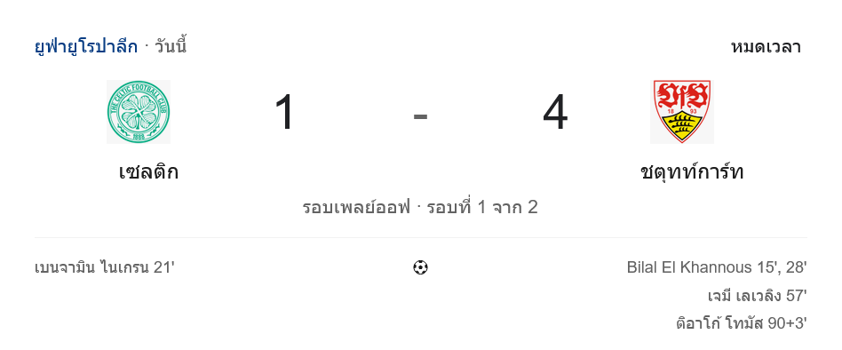 ช่วงท้าย สตุ๊ตการ์ททยอยเปลี่ยนตัวคุมเกม แถมยังมีหมัดปิดกล่อง นาที 93 นิโคลัส นาร์เตย์ ไหลให้ ติอาโก โทมัส ยิงในกรอบเสียบมุมบนซ้ายเป็น 1-4 ปิดไฟสนามแบบไม่ต้องรอเสียงนกหวีด เซลติกพยายามฮึดในช่วงทดเวลาแต่ยิงหลุดกรอบ สุดท้ายจบเกม บ้านผลบอล นัดนี้ต้องยอมรับว่าทีมเยือน “โหดกว่า คมกว่า และเป็นทีมกว่า” ในทุกจังหวะสำคัญ