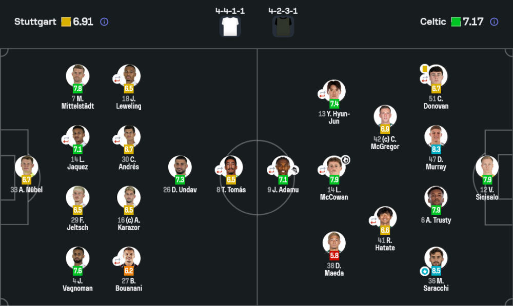 - 🔁 นาทีที่ 64 ถึง 85 ทั้งสองทีมสลับเปลี่ยนตัวหลายตำแหน่ง สตุ๊ตการ์ทใส่สติลเลอร์ เดมิรอวิช เฮนดริกส์ และเอล คันนูสส์ ส่วนเซลติกส่งรัลส์ตัน ชวานชารา ตูเนกตี นือเกรน และอิเฮียนาโชลงมาช่วยตั้งรับและสวนกลับ