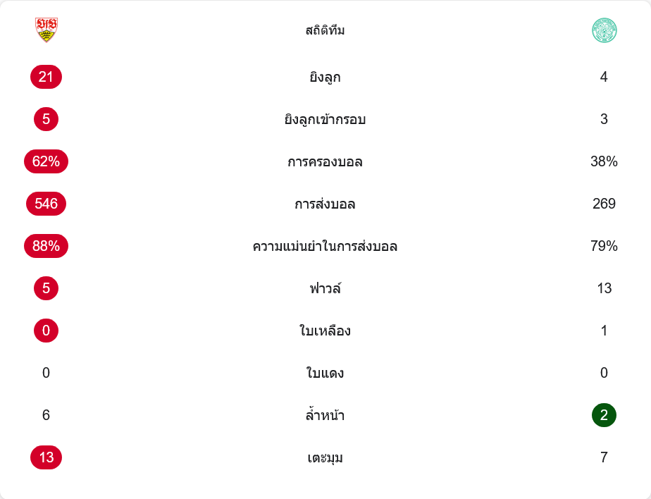 ตัวเลขหลังเกมช่วยยืนยันว่าฝ่ายที่เข้ารอบคือทีมที่ทำการบ้านมาดีตลอดสองเลก เจ้าบ้านสตุ๊ตการ์ทยิงรวมถึง 21 ครั้ง เข้ากรอบ 5 ครั้ง ขณะที่เซลติกมีโอกาสเพียง 4 ครั้ง แต่เข้ากรอบ 3 และเปลี่ยนหนึ่งในนั้นเป็นประตูได้สำเร็จ สัดส่วนการครองบอลอยู่ที่ 62 ต่อ 38 เปอร์เซ็นต์ ส่งบอลสำเร็จ 546 ครั้งเทียบกับ 269 ของทีมเยือน ความแม่นยำของม้าขาวแตะระดับ 88 เปอร์เซ็นต์ เหนือกว่าเซลติกที่ 79 เปอร์เซ็นต์อย่างชัดเจน