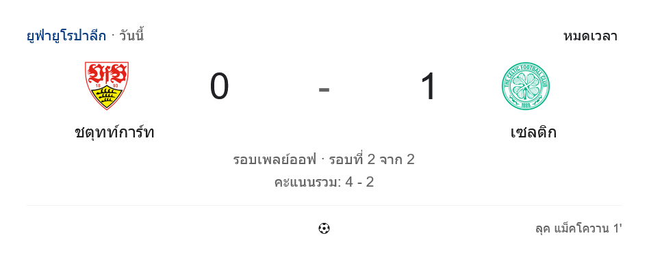 ผลชนะ 1-0 ของเซลติกในเยอรมนีอาจทำให้แฟนบอลทีมเยือนภูมิใจว่าทีมต่อกรกับสตุ๊ตการ์ทได้อย่างเต็มที่ แต่เมื่อมองภาพรวมสองเลก สกอร์รวม 4-2 ยังเป็นของม้าขาวอย่างชัดเจน การเข้ารอบของสตุ๊ตการ์ทจึงไม่ใช่เรื่องฟลุก แต่เป็นผลจากโครงสร้างทีมที่แน่นตลอดซีซัน การจัดการเกมในเลกแรกที่ยิงนำขาด คือหมัดสำคัญที่ทำให้พวกเขามีช่องให้พลาดได้เล็กน้อยในเลกสอง