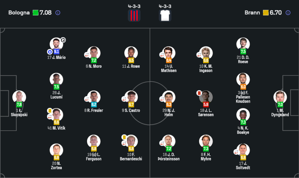 รางวัลผู้เล่นยอดเยี่ยมแบบไร้ข้อโต้เถียงตกเป็นของ ชูเอา มาริโอ แบ็กซ้ายจอมบุกของโบโลญญ่า เจ้าตัวได้คะแนนสูงถึง 9.1 ไม่ใช่แค่เพราะประตูชัยที่ยิงได้อย่างเด็ดขาด แต่ยังมาจากบทบาทตลอด 90 นาทีที่วิ่งเติมเกมรุกไม่หยุด ทั้งครอส ทั้งลากตัดเข้าในสร้างความปั่นป่วนให้แนวรับบรานน์จนหัวหมุน
