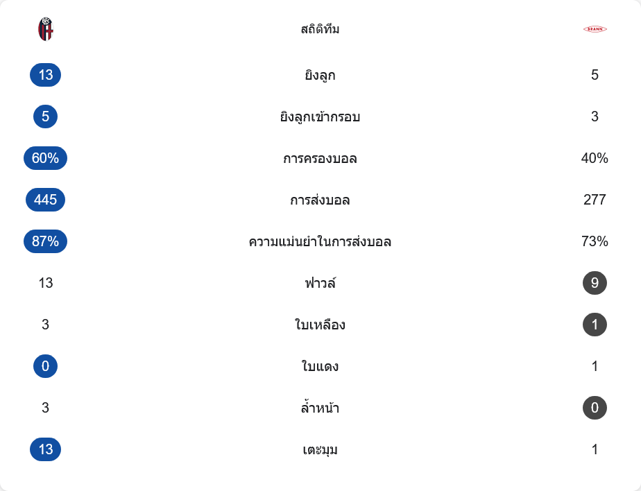 ตัวเลขหลังเกมสะท้อนชัดว่าโบโลญญ่าเป็นฝ่ายครองเกมตั้งแต่ต้นจนจบ เจ้าถิ่นยิงทั้งหมด 13 ครั้ง เข้ากรอบ 5 ครั้ง ขณะที่บรานน์ยิงเพียง 5 ครั้ง เข้ากรอบ 3 ครั้งเท่านั้น การครองบอลอยู่ที่ 60 ต่อ 40 เปอร์เซ็นต์ โบโลญญ่าจ่ายบอลสำเร็จถึง 445 ครั้ง ด้วยความแม่นยำ 87 เปอร์เซ็นต์ ส่วนบรานน์จ่ายเพียง 277 ครั้ง ความแม่นยำ 73 เปอร์เซ็นต์ แสดงให้เห็นว่าทีมเยือนต้องวิ่งไล่และใช้พละกำลังในการป้องกันมากกว่ามีบอลในเท้า