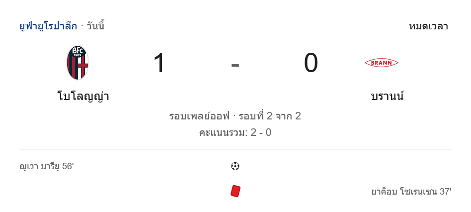 • ⏱ นาที 90+4: จบเกม โบโลญญ่าชนะ 1-0 สกอร์รวม 2-0 ผ่านเข้าสู่รอบถัดไปของยูโรปา ลีก