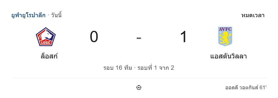 บ้านกีฬา สรุป ผลบอลสด ศึก ยูฟ่า ยูโรปา ลีก รอบ 16 ทีม นัดแรก ลีลล์เปิดบ้านสู้เต็มกำลัง แต่สุดท้ายโดน แอสตัน วิลล่า บุกเชือด 1-0 จากประตูเดียวของ โอลลี่ วัตกินส์ ในนาที 61 ส่งให้ทีมของ อูไน เอเมรี่ กุมความได้เปรียบก่อนกลับไปเล่นนัดสองในบ้านแบบเหนือกว่าเล็ก ๆ แต่มีน้ำหนักมาก