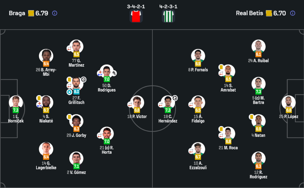 ในมุม วิเคราะห์บอล บราก้าใช้ระบบ 3-4-2-1 ได้ค่อนข้างมีวินัย จุดเด่นคือการยืนโซนแน่น เล่นลูกสองดี และอันตรายมากจากลูกตั้งเตะ ประตูที่ได้ก็สะท้อนชัดว่าพวกเขาเตรียมจังหวะเหล่านี้มาดี เกมรับในครึ่งแรกทำได้แข็งแรง โดยเฉพาะการบีบพื้นที่ตรงกลางไม่ให้เบติสเล่นง่าย
