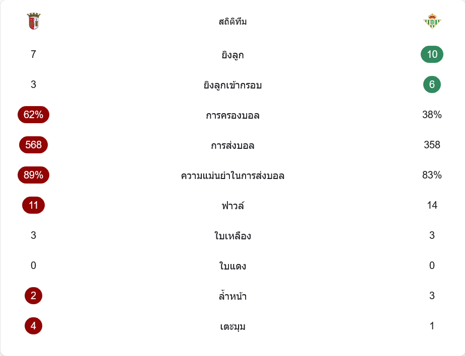 แม้บราก้าจะครองบอลมากถึง 62 เปอร์เซ็นต์ และจ่ายบอล 568 ครั้งด้วยความแม่นยำ 89 เปอร์เซ็นต์ แต่เบติสกลับมีโอกาสยิงมากกว่า โดยยิง 10 ครั้ง เข้ากรอบ 6 ครั้ง ขณะที่เจ้าถิ่นยิง 7 ครั้ง เข้ากรอบ 3 ครั้ง เกมนี้จึงเป็นภาพชัดของทีมที่คุมบอลมากกว่า แต่คู่แข่งเจาะพื้นที่สุดท้ายได้อันตรายกว่า ด้านวินัยเกม ทั้งสองทีมโดนใบเหลืองฝั่งละ 3 ใบ ไม่มีใบแดง บราก้าฟาวล์ 11 ครั้ง ส่วนเบติสฟาวล์ 14 ครั้ง