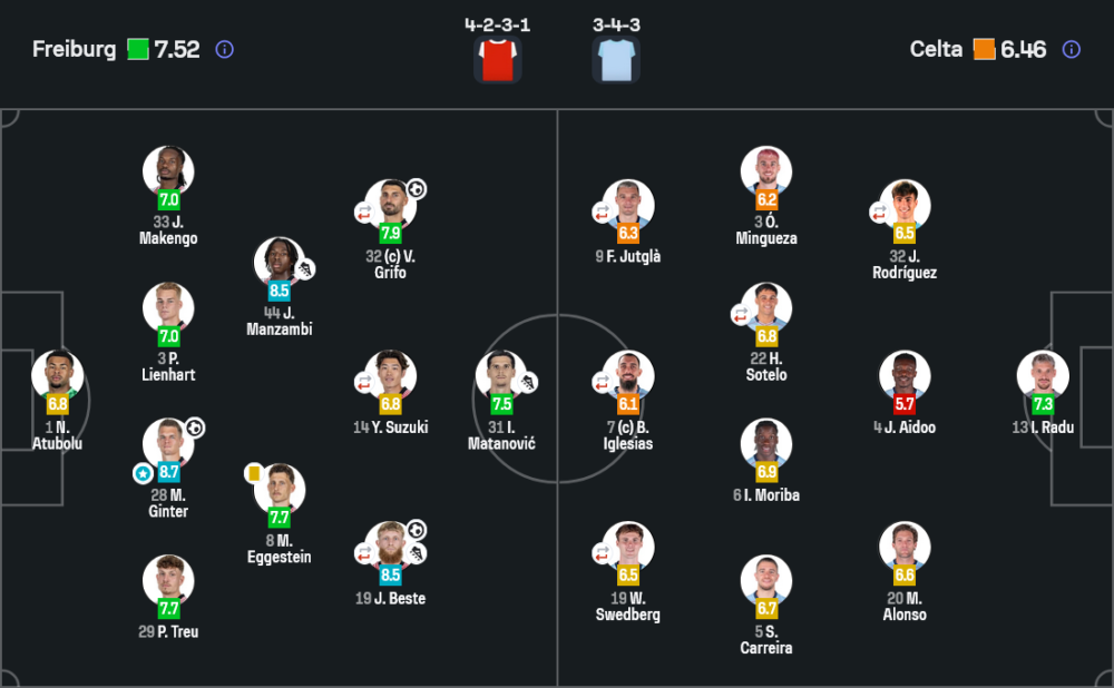 ไฟรบวร์กมาในระบบ 4-2-3-1 และเล่นอย่างมีวินัยมาก เกมรุกเด่นที่การขึ้นบอลเร็วจากด้านข้าง การเคลื่อนที่สลับตำแหน่งของ เบสเต, มันซัมบี และกริโฟ ทำให้แนวรับเซลต้าจับจังหวะยาก ประตูแรกมาจากความเด็ดขาดนอกกรอบของกริโฟ ประตูสองเกิดจากการเข้าพื้นที่แบบแม่นยำ และลูกสามเป็นหลักฐานว่าเจ้าถิ่นอันตรายแม้แต่ลูกตั้งเตะ