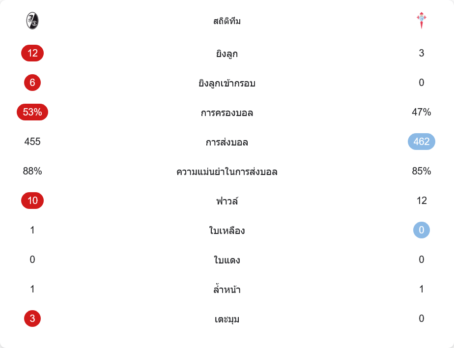 ในมุม วิเคราะห์บอล เกมรับ ไฟรบวร์กทำได้แน่นมาก ยืนตำแหน่งดี ปิดพื้นที่ในเขตโทษ และบีบให้เซลต้าต้องยิงไกลหรือยิงในจังหวะไม่ถนัด สถิติที่ทีมเยือนยิง 3 ครั้งไม่เข้ากรอบเลย สะท้อนชัดว่าระบบป้องกันของเจ้าบ้านคุมอยู่ทั้งหมด