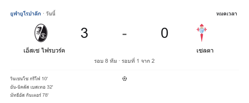 บ้านกีฬา พาไล่เกม ผลบอลล่าสุด นัดนี้แบบเข้มข้น หลัง ไฟรบวร์ก เปิดบ้านอัด เซลต้า บีโก้ 3-0 ในศึก ยูฟ่า ยูโรปา ลีก รอบ 8 ทีม นัดแรก ด้วยฟอร์มที่ดุดันกว่าแทบทุกด้าน เจ้าถิ่นเร่งเกมเร็ว กดดันต่อเนื่อง และเปลี่ยนความเหนือกว่าให้เป็นสกอร์แบบเด็ดขาด ส่วนทีมเยือนพยายามแก้เกมหลายครั้งแต่ไม่สามารถเจาะแนวรับเจ้าบ้านได้เลย ใครตามเช็ก ผลบอลสด คู่นี้ต้องบอกว่าชัยชนะของไฟรบวร์กชัดเจนตั้งแต่รูปเกมจนถึงผลลัพธ์