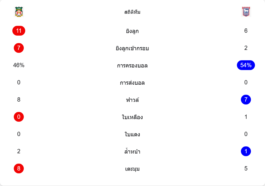 ตัวเลขหลังเกมสะท้อนรูปเกมได้ชัดเจน เร็กซ์แฮมยิงรวม 11 ครั้ง เข้ากรอบถึง 7 ส่วนอิปสวิชมีโอกาสยิงเพียง 6 ครั้ง เข้ากรอบแค่ 2 แม้ทีมเยือนจะครองบอลมากกว่า 54% ต่อ 46% แต่โอกาสจบสกอร์อันตรายกลับเป็นของเจ้าถิ่นมากกว่าอย่างเห็นได้ชัด เกมเต็มไปด้วยจังหวะปะทะกลางสนาม ทั้งสองทีมทำฟาวล์ใกล้เคียงกัน 8 ต่อ 7 ใบเหลืองมีเพียงใบเดียวให้เอเกลีของอิปสวิช ไม่มีใบแดงเกิดขึ้น ตำแหน่งล้ำหน้า เร็กซ์แฮมหลุดล้ำหน้าถึง 2 ครั้ง ส่วนอิปสวิช 1 ครั้ง และลูกเตะมุมเร็กซ์แฮมเหนือกว่าชัด 8 ต่อ 5 แสดงถึงการบุกเข้าไปกดดันในพื้นที่สุดท้ายของทีมเยือนอยู่เรื่อย ๆ