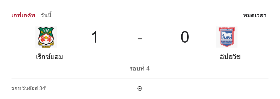 - 🏁 จบเกม เร็กซ์แฮมชนะอิปสวิช 1-0 ผ่านเข้ารอบต่อไปของเอฟเอ คัพ