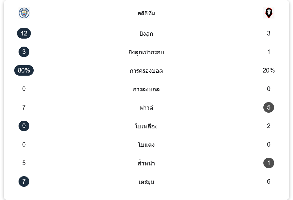 ตัวเลขหลังเกมสะท้อนภาพชัดเจน ซิตี้กดดันด้วยการยิงรวม 12 ครั้ง เข้ากรอบ 3 ครั้ง ขณะที่ทีมเยือนมีโอกาสเพียง 3 ครั้ง เข้ากรอบแค่ 1 ครั้งเท่านั้น สัดส่วนการครองบอลฝั่งเจ้าถิ่นสูงถึง 80% เทียบกับซอลฟอร์ดที่มีเพียง 20% ทำให้รูปเกมเป็นการบุกวันเวย์เกือบตลอดทั้ง 90 นาที