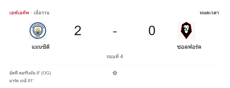 - ⏱️ นาที 90+2 ทดเวลาเพิ่ม 2 นาที ก่อนผู้ตัดสินเป่าจบเกม ซิตี้ชนะ 2-0 ผ่านเข้ารอบอย่างสวยงาม