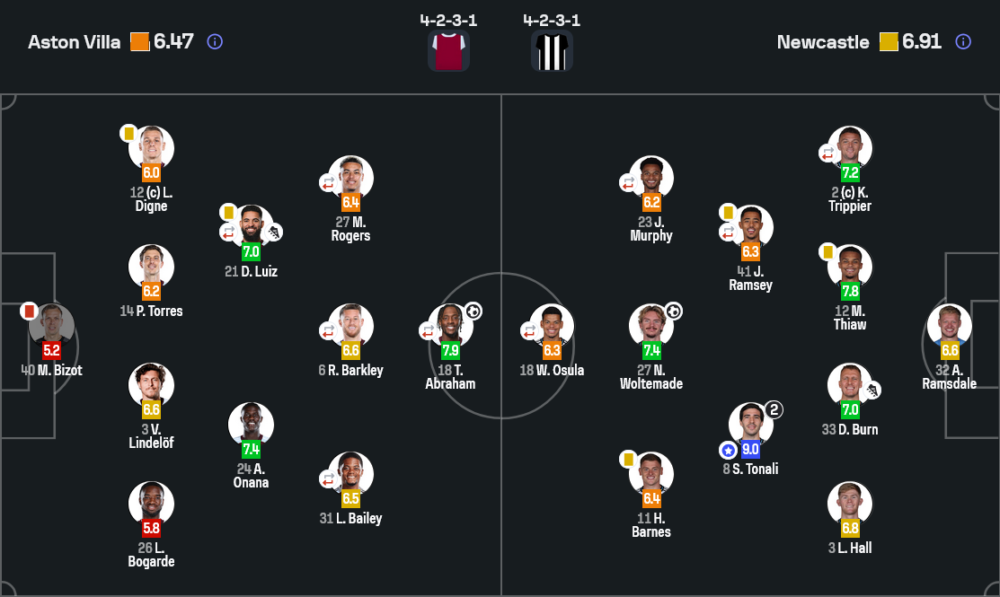 ไม่ต้องสงสัยเลยว่าแมน ออฟ เดอะ แมตช์ของเกมนี้คือซานโดร โตนาลี มิดฟิลด์อิตาเลียนของนิวคาสเซิ่ลที่ได้คะแนนสูงถึง 9.0 ในค่ำคืนที่วิลล่า พาร์ค เขาเล่นบททั้งโฮลด์บอล คุมจังหวะ และตัวจบสกอร์ไปพร้อมกัน โตนาลีสัมผัสบอลตลอดทุกจังหวะสำคัญในแดนกลาง คอยดึงคู่แข่งออกจากตำแหน่งก่อนจะไหลบอลออกริมเส้นหรือยิงเองเมื่อมีช่อง