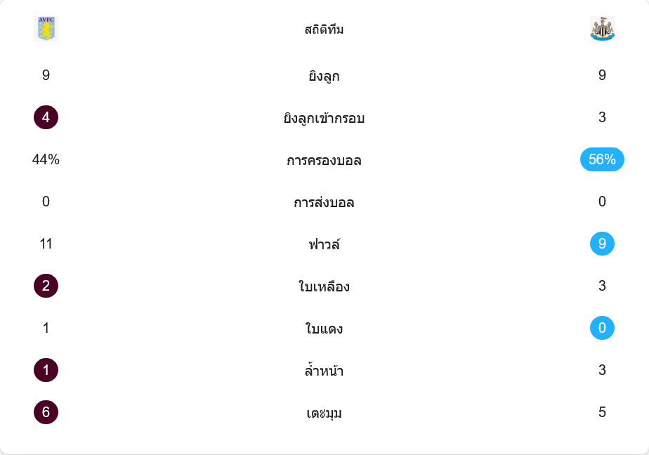 ตัวเลขหลังเกมสะท้อนรูปเกมชัดเจน ทั้งสองทีมมียิงรวมฝั่งละ 9 ครั้ง แต่การครองบอลกลายเป็นของนิวคาสเซิ่ลที่ทำได้ 56% ขณะที่วิลล่าถอยไปถือบอลเพียง 44% เท่านั้น วิลล่าได้ยิงเข้ากรอบ 4 ครั้ง ส่วนทีมเยือนแม้จะเข้ากรอบแค่ 3 ครั้ง แต่เปลี่ยนเป็น 3 ประตูเต็มเม็ดเต็มหน่วย ความดุดันของสาลิกาดงยังเห็นได้จากการทำฟาวล์ถึง 9 ครั้ง มากกว่าวิลล่าที่ 11 ครั้งเล็กน้อย แต่ไม่มีใบแดงแม้แต่ใบเดียว ในขณะที่เจ้าถิ่นโดน 2 ใบเหลืองบวก 1 ใบแดง ขณะที่นิวคาสเซิ่ลมี 3 ใบเหลือง ล้ำหน้ากันไป 1-3 ครั้ง และเตะมุมวิลล่า 6 ลูกต่อนิวคาสเซิ่ล 5 ลูก แสดงให้เห็นว่าเจ้าถิ่นยังมีโอกาสจากลูกตั้งเตะ แต่จบไม่คมพอในวันที่ต้องวิ่งไล่ด้วยคนที่น้อยกว่า