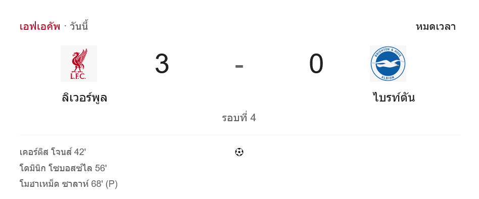 ช่วงท้ายเกม สลอตถอดตัวหลักเก็บแรง ส่ง ฮูโก้ เอกีตีเก้, ริโอ งูมูโอฮา, โจ โกเมซ, เคลวิน แรมซีย์ และดาวรุ่งอย่าง เทรย์ นโยนี ลงมาเก็บประสบการณ์ ส่วนไบรท์ตันแม้จะได้ลุ้นจากมิโตมะและลูกโหม่งท้ายเกมของ โอลิวิเยร์ บอสก๊ากลี ในนาที 95 แต่บอลก็ยังเหินข้ามคาน จบเกมลิเวอร์พูลเปิดบ้านต้อน 3-0 เข้ารอบถัดไปแบบไม่เสียประตู