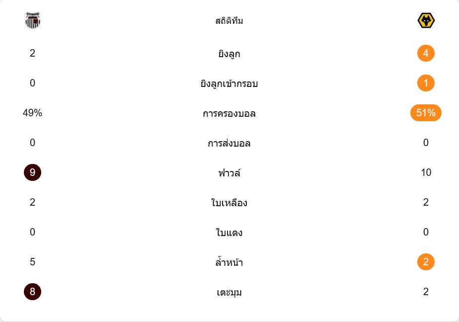 - 🟨 นาที 34: Cameron McJannett โดนใบเหลือง ขณะที่ João Gomes ปั่นฟรีคิกชนคานหวิดเป็นประตูขึ้นนำให้วูล์ฟส์
