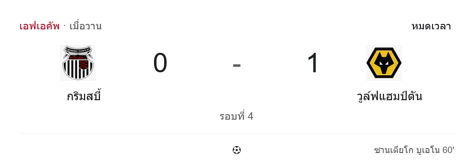 ทดเวลาบาดเจ็บ 4 นาที เจ้าถิ่นโหมเก็บทุกเม็ด เตะมุมอีกครั้งในนาที 95 แต่จังหวะสุดท้ายไม่ผ่านกำแพงสีทองของวูล์ฟส์ หมดเวลา กริมสบี้ ทาวน์ พ่ายคาบ้าน 0-1 ต้องหยุดเส้นทางบอลถ้วย ส่วนวูล์ฟส์ตีตั๋วสู่รอบ 5 อย่างสมภาคภูมิ