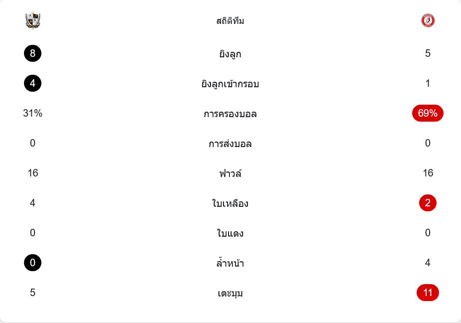 เกมนี้พอร์ท เวล ยิงรวม 8 ครั้ง มากกว่าบริสตอลที่ยิง 5 ครั้ง และที่ต่างชัดคือความคมเมื่อเจ้าถิ่นยิงเข้ากรอบถึง 4 ครั้ง ขณะที่ทีมเยือนเข้ากรอบเพียง 1 ครั้ง แม้บริสตอลจะครองบอลสูงถึง 69 เปอร์เซ็นต์ แต่พอร์ท เวล ครองบอลแค่ 31 เปอร์เซ็นต์ก็ยังสร้างโอกาสจบสกอร์ได้มากกว่า รูปเกมมีการปะทะหนักจนฟาวล์เท่ากัน 16 ต่อ 16 พอร์ท เวล ได้ใบเหลือง 4 ใบ ส่วนบริสตอลได้ 2 ใบ และไม่มีใบแดงทั้งสองฝั่ง เรื่องลูกนิ่งสะท้อนแรงกดดันของทีมเยือน เพราะบริสตอลได้เตะมุมถึง 11 ครั้ง ขณะที่พอร์ท เวล ได้ 5 ครั้ง แต่สุดท้ายทีมที่ “เอาอยู่” ในกรอบของตัวเองคือฝ่ายชนะ
