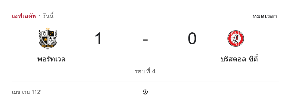 แมตช์นี้คือเกมน็อกเอาต์ที่ไม่มีคำว่าแก้ตัว พอร์ท เวล เบียดชนะในช่วงต่อเวลา 1-0 ส่งผลให้พวกเขาผ่านเข้าสู่รอบถัดไปของ เอฟเอ คัพ ด้วยโมเมนตัมแบบทีมที่ “ใจถึง” ส่วนบริสตอล ซิตี้ ต้องหยุดเส้นทางไว้แค่รอบนี้ แม้รูปเกมจะครองบอลเหนือกว่า แต่จังหวะสุดท้ายไม่เฉียบพอ และโดนลงโทษจากความผิดพลาดเพียงครั้งเดียว