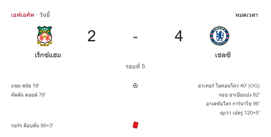 เกม เอฟเอ คัพ อังกฤษ คู่นี้เดือดสมราคาจริง ๆ เมื่อเร็กซ์แฮมสู้แบบไม่กลัวชื่อชั้น ก่อนพ่าย เชลซี 2-4 หลังต่อเวลาพิเศษ โดย ผลบอลสด นัดนี้เต็มไปด้วยจังหวะพลิกไปพลิกมา ทั้งประตูสวย ใบแดง และดราม่า VAR ครบสูตรเกมบอลถ้วย