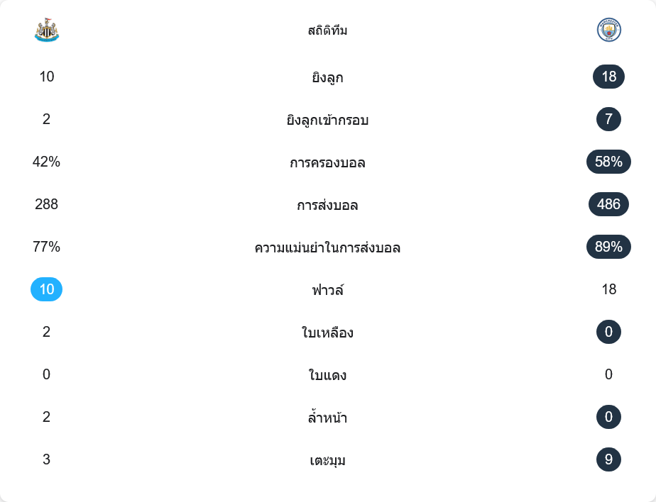 แมนฯ ซิตี้เป็นฝ่ายคุมเกมได้เหนือกว่าในภาพรวม พวกเขายิง 18 ครั้ง เข้ากรอบ 7 ครั้ง ครองบอล 58 เปอร์เซ็นต์ และผ่านบอล 486 ครั้งด้วยความแม่นยำ 89 เปอร์เซ็นต์ ส่วนนิวคาสเซิ่ลยิง 10 ครั้ง เข้ากรอบ 2 ครั้ง ครองบอล 42 เปอร์เซ็นต์ และผ่านบอล 288 ครั้ง ความแม่นยำ 77 เปอร์เซ็นต์ นอกจากนี้ทีมเยือนยังได้เตะมุมมากถึง 9 ครั้ง เทียบกับเจ้าถิ่นที่ได้ 3 ครั้ง สะท้อนชัดว่าแมนฯ ซิตี้กดดันต่อเนื่องกว่า โดยเฉพาะในช่วงครึ่งหลัง