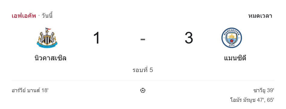จาก : ผลบอลสด เอฟเอ คัพ อังกฤษ ระหว่าง นิวคาสเซิ่ล 1-3 แมนซิตี้ วันนี้ 8/3/69 – บ้านกีฬา