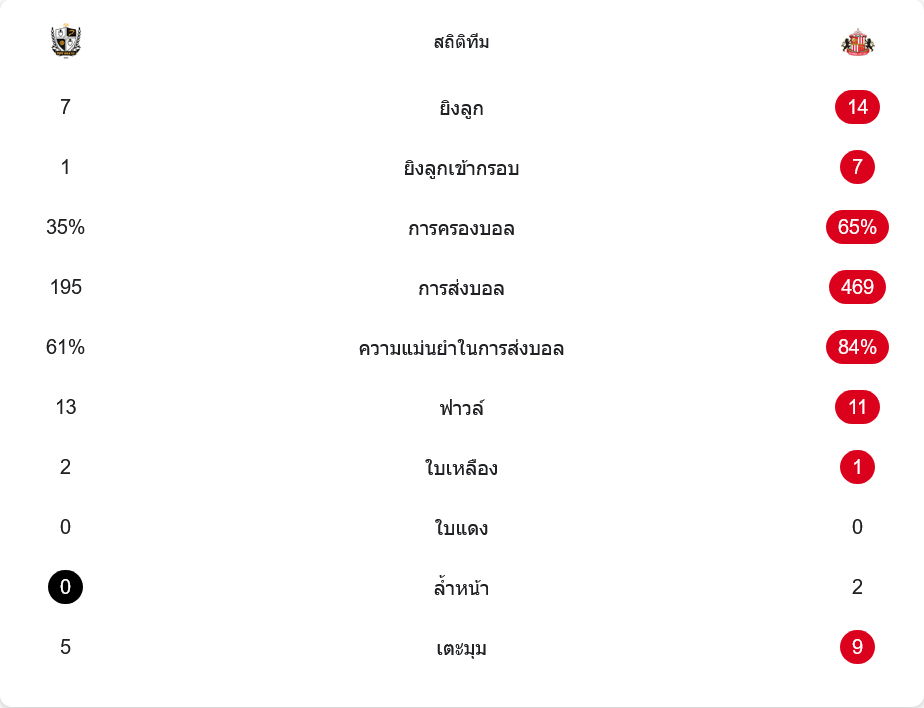 เกมนี้ซันเดอร์แลนด์เหนือกว่าชัดในเรื่องตัวเลข พวกเขายิง 14 ครั้ง เข้ากรอบ 7 ครั้ง ครองบอล 65 เปอร์เซ็นต์ จ่ายบอล 469 ครั้ง และจ่ายแม่น 84 เปอร์เซ็นต์ ขณะที่พอร์ท เวล ยิง 7 ครั้ง เข้ากรอบ 1 ครั้ง ครองบอล 35 เปอร์เซ็นต์ จ่ายบอล 195 ครั้ง แม่นยำ 61 เปอร์เซ็นต์ แต่ฟุตบอลไม่ได้วัดกันแค่ปริมาณ เพราะเจ้าถิ่นเปลี่ยนโอกาสเดียวให้เป็นประตูชัยได้สำเร็จ