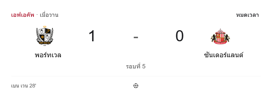 ศึก เอฟเอ คัพ อังกฤษ รอบ 5 เกมนี้จบแบบพลิกอารมณ์แฟนบอลไม่น้อย เมื่อพอร์ท เวล เปิดบ้านเฉือนซันเดอร์แลนด์ 1-0 จากประตูชัยของ เบน เวน นาที 28 กลายเป็นอีกหนึ่งแมตช์ ผลบอลสด ที่ชี้ชัดว่า บอลถ้วยไม่ได้ตัดสินกันด้วยชื่อชั้น แต่ตัดสินกันที่ความคมและวินัยในสนามล้วน ๆ