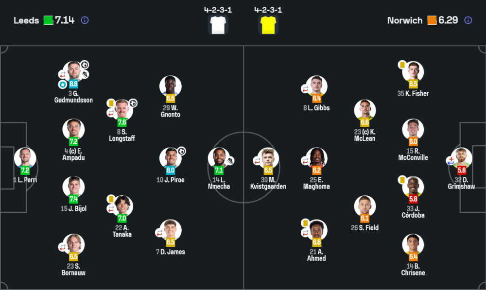 ถ้ามองในเชิง วิเคราะห์บอล เกมนี้ ลีดส์ชนะเพราะเล่นเป็นระบบกว่าในจังหวะสำคัญ พวกเขาใช้ 4-2-3-1 เหมือนนอริช แต่คุณภาพการเล่นในพื้นที่สุดท้ายต่างกันชัด ลีดส์ขึ้นเกมฝั่งซ้ายได้อันตรายมาก โดย Gudmundsson เป็นตัวเร่งเกม ส่วน Longstaff กับ Piroe คอยเติมเข้าพื้นที่ยิงแบบได้ลุ้นตลอด