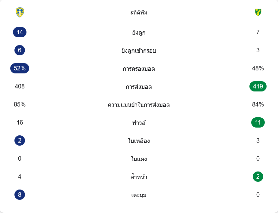 เกมนี้ลีดส์ยิง 14 ครั้ง เข้ากรอบ 6 ครั้ง ส่วนนอริชยิง 7 ครั้ง เข้ากรอบ 3 ครั้ง การครองบอลใกล้เคียงกัน โดยลีดส์มี 52 เปอร์เซ็นต์ และนอริช 48 เปอร์เซ็นต์ ด้านการผ่านบอล นอริชต่อบอล 419 ครั้ง ลีดส์ 408 ครั้ง แต่เจ้าบ้านมีความแม่นยำดีกว่าเล็กน้อยที่ 85 เปอร์เซ็นต์ مقابل 84 เปอร์เซ็นต์ ลีดส์ทำฟาวล์ 16 ครั้ง นอริช 11 ครั้ง ได้ใบเหลือง 2 ต่อ 3 ไม่มีใบแดง และเจ้าถิ่นได้เตะมุมถึง 8 ครั้ง ขณะที่นอริชไม่มีแม้แต่ครั้งเดียว สะท้อนชัดว่าเกมบุกของลีดส์กดใส่ได้ต่อเนื่องกว่า