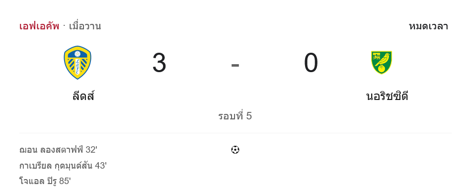 ศึก เอฟเอ คัพ อังกฤษ รอบ 5 เกมนี้จบแบบแฟนเจ้าถิ่นสะใจเต็มเสียง เมื่อ ลีดส์ ยูไนเต็ด เปิดบ้านต้อน นอริช ซิตี้ 3-0 จากฟอร์มที่เด็ดขาดกว่าแทบทุกจังหวะสำคัญ ใครที่ตามเช็ก ผลบอลสด ระหว่างเกมจะเห็นชัดว่าเจ้าบ้านเป็นฝ่ายคุมโมเมนตัมได้ดีกว่า โดยเฉพาะเกมรุกที่เล่นกันไหลลื่นและกดดันแนวรับนอริชได้ตลอด