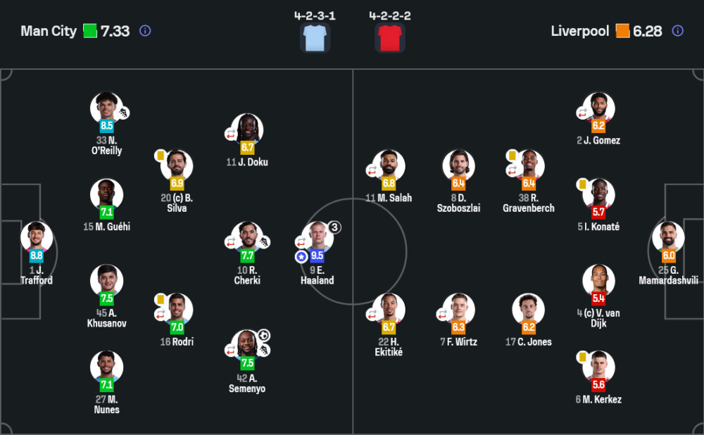 เออร์ลิง ฮาลันด์ คือนักเตะที่ดีที่สุดของเกมนี้แบบไร้ข้อกังขา หลังซัดแฮตทริกและได้คะแนนสูงสุด 9.5 ดาว เขาแสดงให้เห็นทั้งความนิ่ง ความแข็งแกร่ง และการยืนตำแหน่งระดับเวิลด์คลาส ทุกครั้งที่ซิตี้มีโอกาสในเขตโทษ ฮาลันด์คือคนที่ทำให้มันกลายเป็นฝันร้ายของลิเวอร์พูลทันที