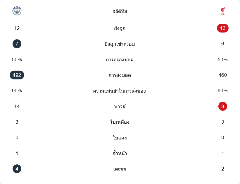 รูปเกมไม่ได้ห่างกันแบบตัวเลขขาด แมนฯ ซิตี้ยิง 12 ครั้ง ลิเวอร์พูลยิง 13 ครั้ง และทั้งสองทีมครองบอลเท่ากันที่ 50 เปอร์เซ็นต์ การผ่านบอลของซิตี้อยู่ที่ 492 ครั้ง ส่วนลิเวอร์พูล 460 ครั้ง โดยมีความแม่นยำเท่ากันที่ 90 เปอร์เซ็นต์ แต่สิ่งที่ทำให้ผลการแข่งขันต่างกันคือคุณภาพของโอกาสและความเด็ดขาดในจังหวะสุดท้าย ซิตี้ยิงเข้ากรอบ 7 ครั้งและเปลี่ยนเป็น 4 ประตู ขณะที่ลิเวอร์พูลเข้ากรอบ 6 ครั้งแต่ยิงไม่ได้เลย แถมยังพลาดจุดโทษอีกด้วย