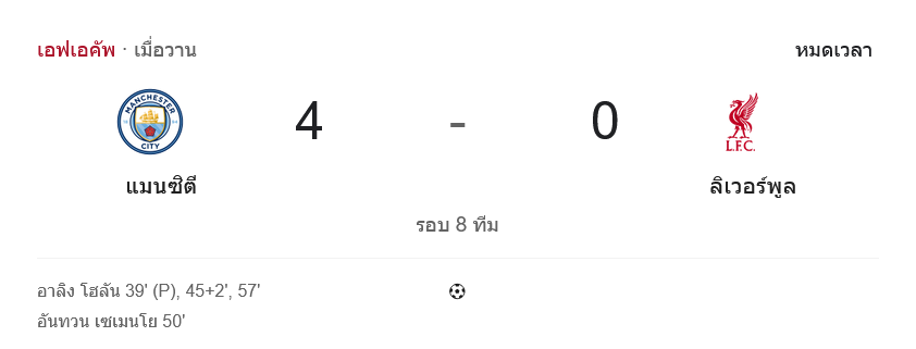 ลิเวอร์พูลมีจังหวะตอบโต้ มีโอกาสจบ และสร้างปัญหาให้แนวรับซิตี้ได้บ้าง แต่เมื่อถึงจังหวะชี้เป็นชี้ตายกลับไม่เด็ดขาดพอ สวนทางกับทีมของเป๊ปที่ลงโทษทุกความผิดพลาดได้แบบเลือดเย็น โดยเฉพาะเออร์ลิง ฮาลันด์ ที่ระเบิดฟอร์มโหดกดแฮตทริกพาทีมไล่ขยี้หงส์แดงจนหมดสภาพ