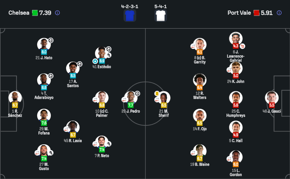 - กองกลาง : อันเดรย์ ซานโตส 8.5 , โรเมโอ ลาเวีย 6.7 , โคล พาลเมอร์ 6.8 , เจา เปโดร 7.7 , เปโดร เนโต้ 7.4