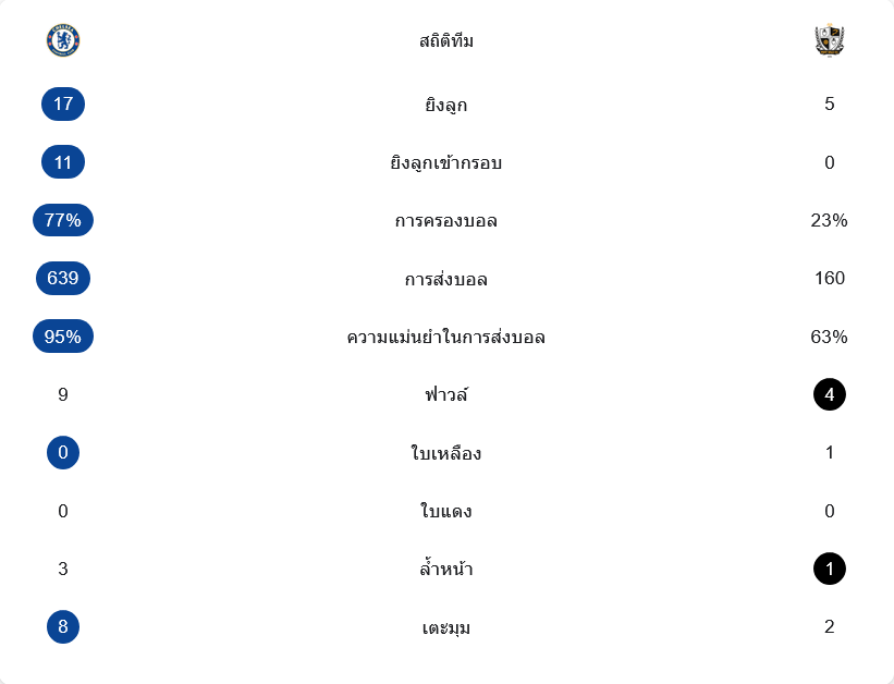 เกมนี้เชลซีเหนือกว่าชัดเจนทุกมิติ พวกเขายิง 17 ครั้ง เข้ากรอบ 11 ครั้ง ขณะที่พอร์ท เวลยิง 5 ครั้งและไม่ตรงกรอบเลย เชลซีครองบอล 77 เปอร์เซ็นต์ จ่ายบอล 639 ครั้ง ด้วยความแม่นยำ 95 เปอร์เซ็นต์ ส่วนทีมเยือนครองบอลแค่ 23 เปอร์เซ็นต์ จ่าย 160 ครั้ง แม่นยำ 63 เปอร์เซ็นต์ นอกจากนี้เชลซียังได้เตะมุม 8 ครั้ง มากกว่าพอร์ท เวลที่ได้ 2 ครั้ง ตัวเลขทั้งหมดสะท้อนชัดว่าเจ้าถิ่นคุมเกมตั้งแต่ต้นจนจบ และสกอร์ 7-0 ก็ตรงกับรูปเกมทุกอย่าง