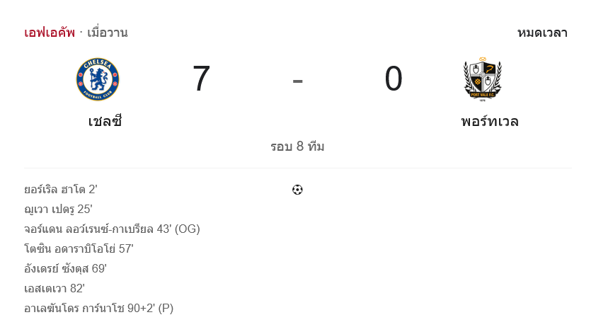 - ⚽ นาที 90+2 อเลฮานโดร การ์นาโช ยิงจุดโทษปิดเกมให้เชลซีชนะ 7-0