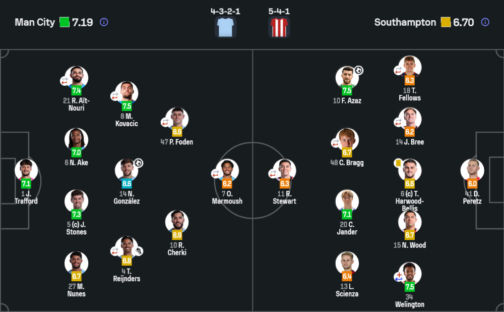 - เปลี่ยนตัว : ซาวินโญ่ 6.7, เฌเรมี่ โดกู 10, นิโก้ โอไรลีย์ 6.6, เออร์ลิง ฮาลันด์ 6.7, แบร์นาร์โด้ ซิลวา 6.7