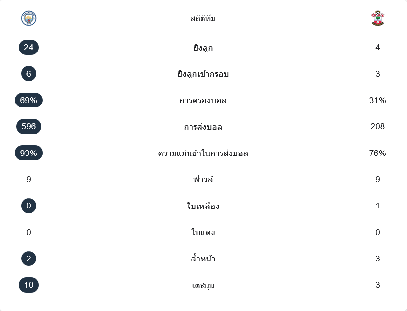 แมนเชสเตอร์ ซิตี้ เหนือกว่าเกือบทุกมิติ ยิงทั้งหมด 24 ครั้ง เข้ากรอบ 6 ครั้ง ครองบอล 69% และจ่ายบอล 596 ครั้ง ด้วยความแม่นยำ 93% ขณะที่ เซาธ์แฮมป์ตัน ยิงเพียง 4 ครั้ง แต่เข้ากรอบถึง 3 ครั้ง ครองบอล 31% จ่ายบอล 208 ครั้ง ความแม่นยำ 76% ทั้งสองทีมทำฟาวล์เท่ากัน 9 ครั้ง เจ้าบ้านไม่มีใบเหลือง ส่วนทีมเยือนโดน 1 ใบ ซิตี้ได้เตะมุมถึง 10 ครั้ง เทียบกับเซาธ์แฮมป์ตัน 3 ครั้ง ภาพรวมชัดเจนว่าเรือใบกดดันหนักตลอดเกม ก่อนปิดบัญชีจากลูกเตะมุมช่วงท้าย