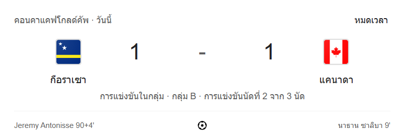 จบ 90 นาที+ทดเวลา คูราเซาเสมอกับแคนาดา 1-1 แบ่งกันไปทีมละแต้ม แคนาดายังนำเป็นจ่าฝูงกลุ่ม B ส่วนคูราเซายังไร้พ่าย ลุ้นเข้ารอบต่อไปมันส์แน่นอน ผลงานแบบนี้บอกเลยว่าสายนี้เดือดทุกแมตช์ บ้านกีฬาขอยกให้เกมนี้เป็นอีกหนึ่งแมตช์ ผลบอลสด ที่ห้ามพลาด