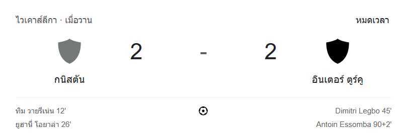 - ทดเวลาบาดเจ็บ:นาทีที่ 90+2: GOAL! อินเตอร์ ตูร์คูตามตีเสมอได้สำเร็จ อองตวน เอสซอมบ้า ซัดจ่อ ๆ ในเขตโทษ ทำให้สกอร์กลับมาเท่ากัน 2-2