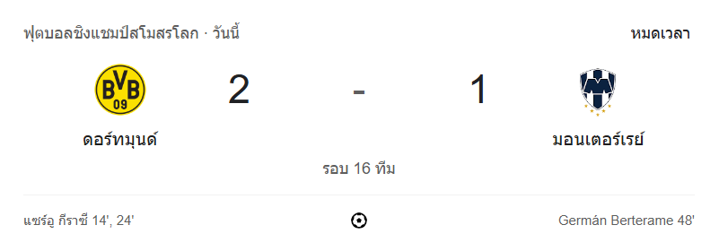• นาทีที่ 96: หมดเวลาการแข่งขัน! ดอร์ทมุนด์ 2-1 มอนเตร์เรย์ ดอร์ทมุนด์ผ่านเข้ารอบไปแบบสุดมัน